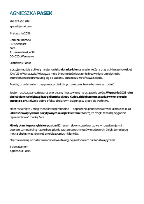 z przyjemnością aplikuję na stanowisko doradcy klienta w salonie Zara przy ul. Marszałkowskiej 104/122 w Warszawie. Wierzę, że moje 2-letnie doświadczenie i rozwinięte umiejętności interpersonalne przyczynią się do wzrostu sprzedaży w Państwa sklepie.