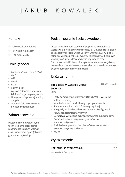 Jestem absolwentem studiów II stopnia na Politechnice Warszawskiej na kierunku Informatyka. Od 2 lat pracuję jako specjalista w zespole Cyber Security w firmie KMPG, gdzie zgłębiam wiedzę z zakresu cyberbezpieczeństwa. Chciałbym wykorzystać swoje doświadczenie w pracy na rzecz Rzeczypospolitej Polskiej, dlatego zatrudnienie w Wojskowej Komendzie Uzupełnień na stanowisku starszego informatyka byłaby spełnieniem moich marzeń.