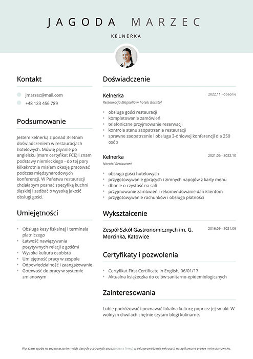 Jestem kelnerką z ponad 3-letnim doświadczeniem w restauracjach hotelowych. Mówię płynnie po angielsku (mam certyfikat FCE) i znam podstawy niemieckiego — do tej pory kilkakrotnie miałam okazję pracować podczas międzynarodowych konferencji. W Państwa restauracji chciałabym poznać specyfiką kuchni śląskiej i zadbać o wysoką jakość obsługi gości.
