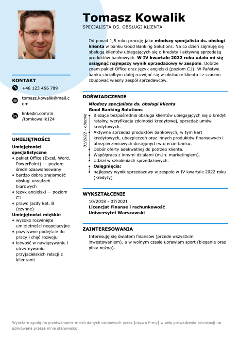 - Umieść na końcu CV klauzulę RODO ze zgodą na przetwarzanie danych osobowych i kontaktowych — w przeciwnym wypadku nie weźmiesz udziału w rekrutacji.