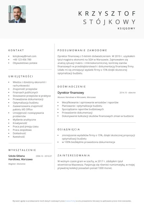 Dyrektor finansowy z 5-letnim doświadczeniem. W 2010 r. uzyskałem tytuł magistra ekonomii na SGH w Warszawie. Zajmowałem się analizą sytuacji makro i mikroekonomicznej, kontrolą stanów finansowych w przedsiębiorstwach i dokumentacją finansową firmy. Udało mi się zmniejszyć wydatki firmy o 17% dzięki skutecznej optymalizacji budżetu.