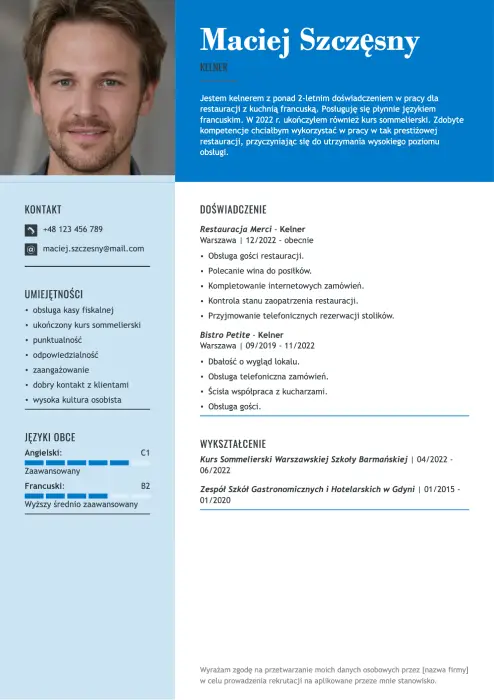 Umieść wymienione wyżej, charakterystyczne dla zawodu kelnera obowiązki, a na pewno zwiększysz swoje szanse w rekrutacji. Podobnie zrób, jeśli potrzebujesz CV po niemiecku.
