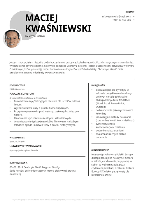 Zobacz przykład we wzorze CV nauczyciela poniżej: